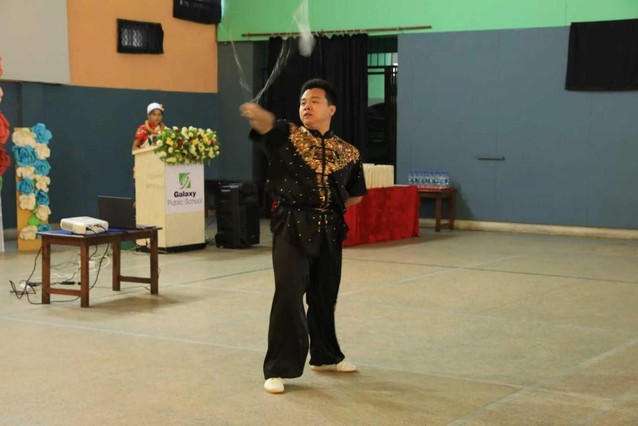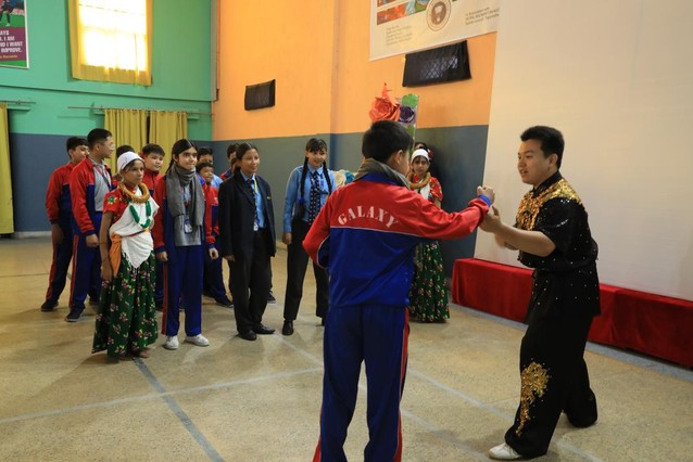 访问期间,郎明璇与其他代表团成员一同和当地院校学生开展了丰富多样的文化交流活动。他们通过剪纸、中国画、漂漆、扎染、书法等中华非物质文化遗产项目的现场示范教学,以互动体验方式让尼泊尔学生沉浸式感受中华优秀传统文化的独特魅力。中尼学生还以舞蹈与武术融合表演、中文歌曲合唱等文艺形式同台演出。郎明璇在表演中展示了龙凤双九节鞭和霍氏八极拳,并现场教授当地学生武术基本动作,引来阵阵掌声。活动结束后,两国学生合影留念,共同记录下这段跨越国界的友谊。