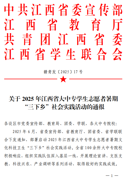 近日,中共江西省委宣传部、江西省教育厅、共青团江西省委、江西省学生联合会联合印发《关于2025年江西省大中专学生志愿者暑期“三下乡”社会实践活动的通报》(赣青联发〔2025〕17号),我院“薪火青年”社会实践队在活动中表现突出,被评为“优秀团队”。